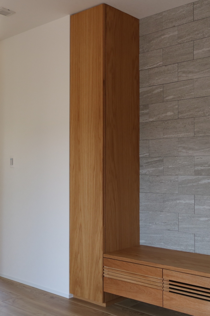 フロートのローボードに天井までスラッと伸びた縦型収納