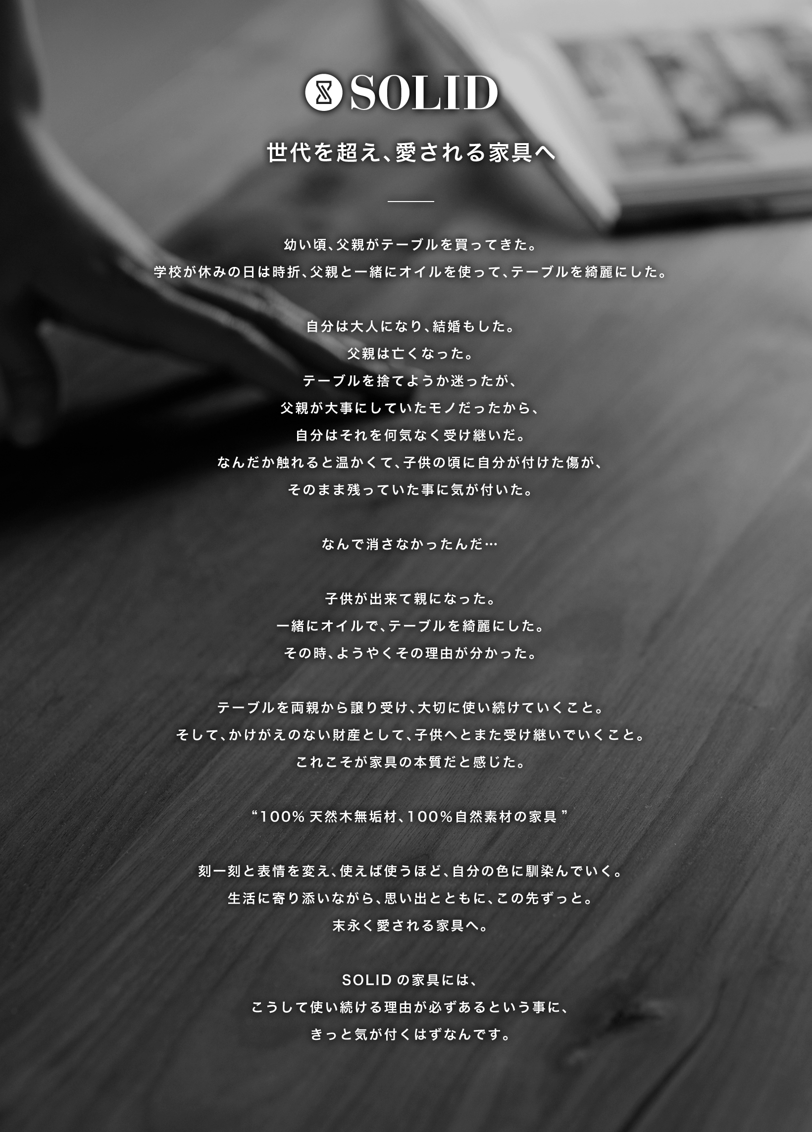とある日に、父親が購入したSOLIDの家具が、息子娘と共に、オイルでメンテナンスを楽しみながら、かけがえのないモノへと育っていく。いつか大好きだった父親が亡くなった時、その時に、子は、下に落ち切ったSOLIDの砂時計を逆さにし、また新たに、当時父親が購入したSOLIDの家具を、かけがえのないモノとして受け継いでいくのです。