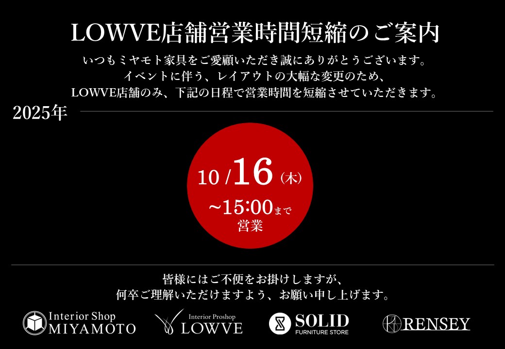 いつもミヤモト家具をご愛顧いただき、ありがとうございます。 誠に勝手ながら、イベントに伴う大幅なレイアウト変更によりLOWVE店舗を下記の日程で営業時間をさせていただきます。 2025年10月16日(木) ~15:00迄営業 お客様にはご不便をおかけいたしますが、何卒ご理解賜りますようお願い申し上げます 。