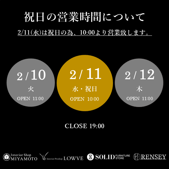 いつもミヤモト家具をご愛顧頂きましてありがとうございます。 2月11日(水)は建国記念の日で祝日となりますため、 通常水曜日は定休日とさせていただいておりますが この日は休まず営業いたします。 皆様のご来店を心よりお待ちしております。